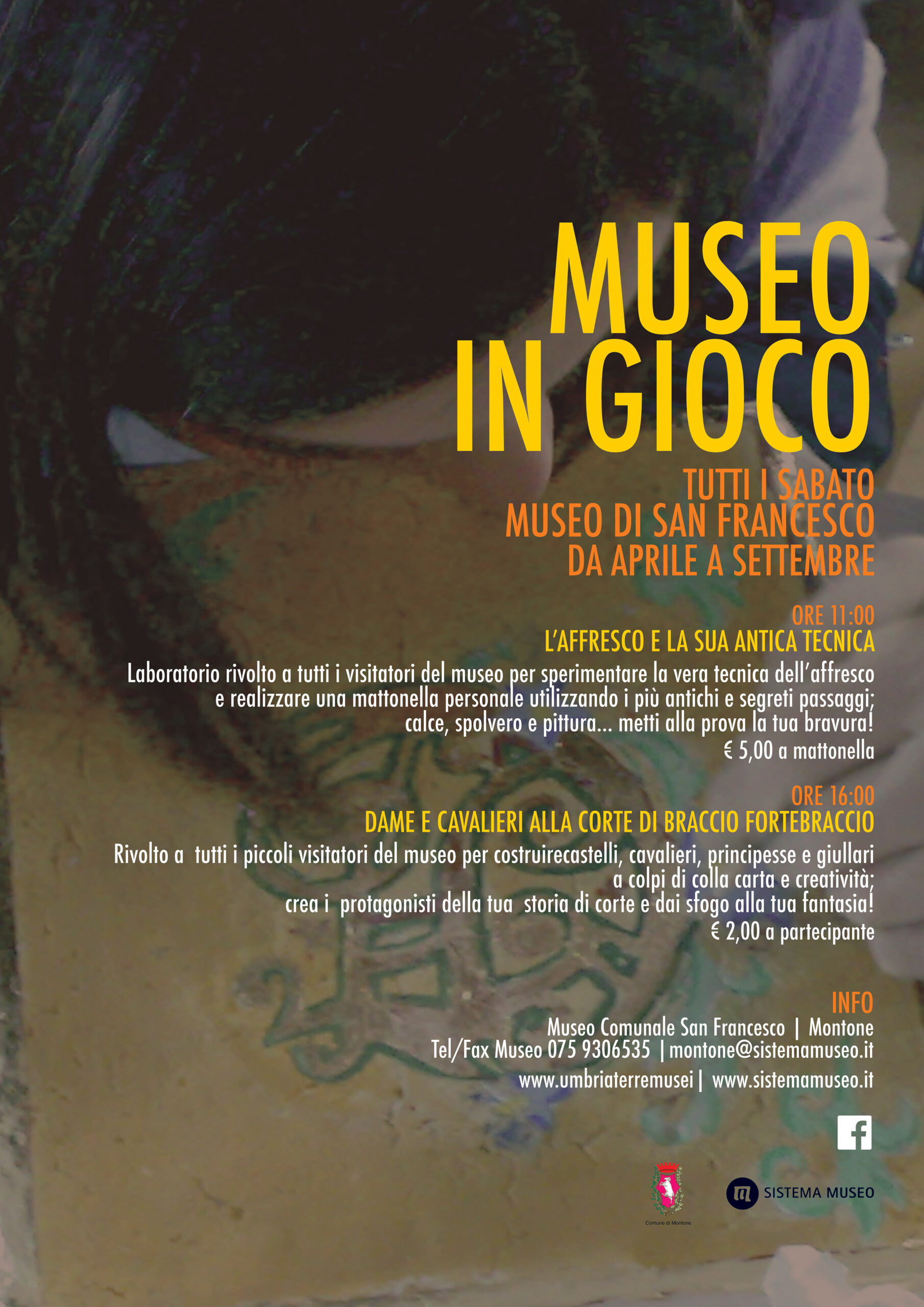 Tutti i sabato da Aprile a Settembre al Museo San Francesco di Montone ore 11,00 “L’affresco e la sua antica tecnica.” Laboratorio rivolto a tutti i visitatori del Museo per sperimentare la vera tecnica dell’affresco e realizzare una mattonella