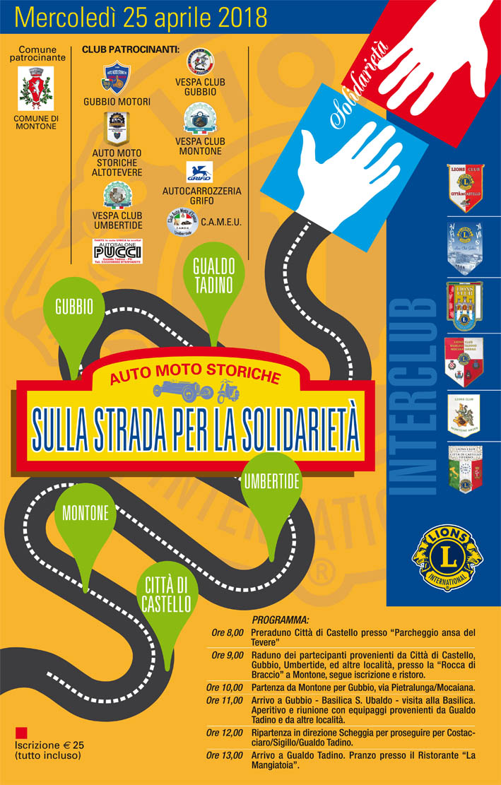 Anche quest’anno i Lions Club Città di Castello, Gubbio, Umbertide, Montone, Città di Castello Tiferno, Gualdo Tadino e Nocera Umbra organizzano la manifestazione “Auto moto storiche – Sulla strada per la solidarietà”, in programma mercoledì 25 aprile. L