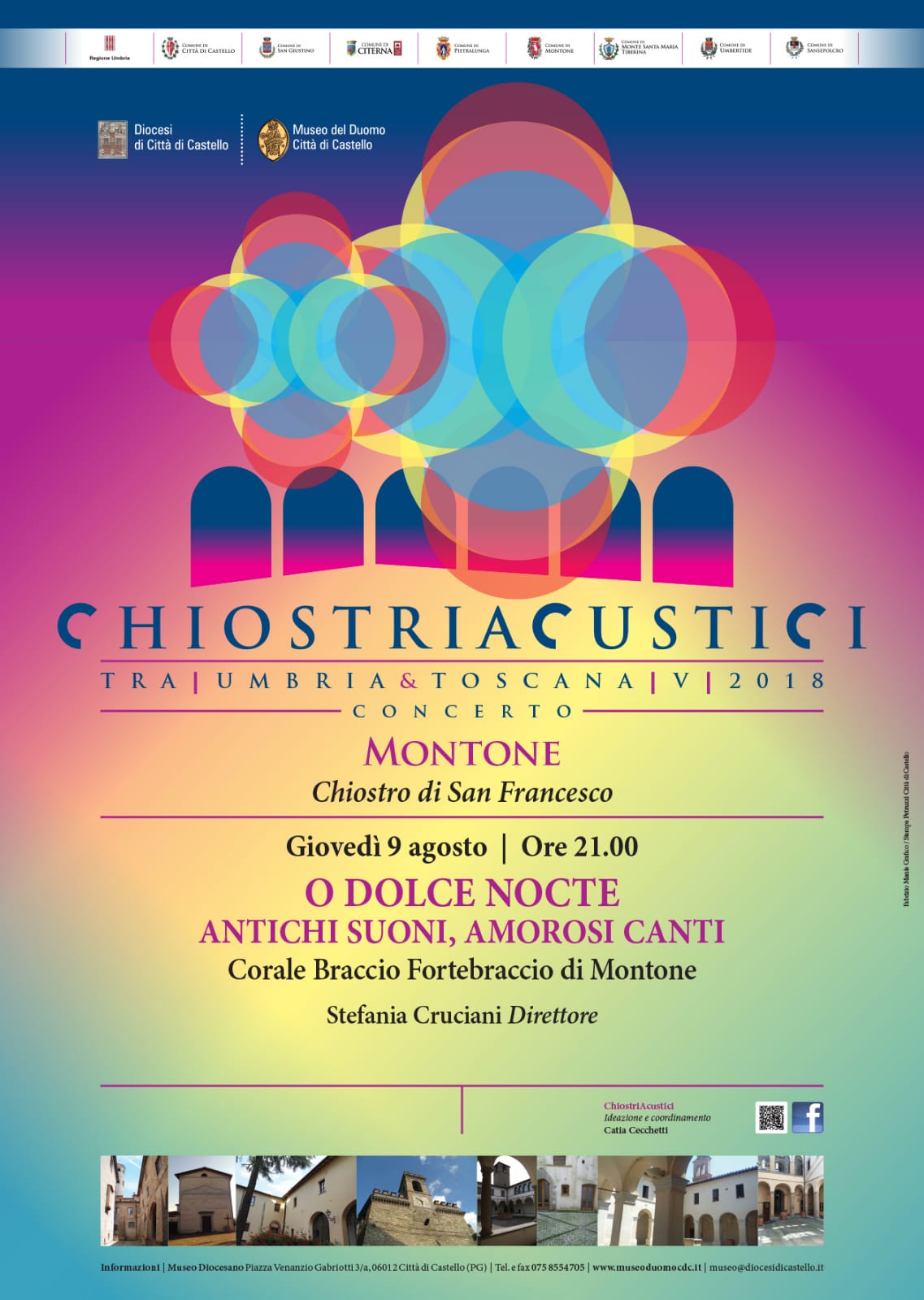 La Rassegna “ChiostriAcustici” 2018 Concerto all’interno del Chiostro di San Francesco – Montone Giovedì 9 Agosto alle ore 21.00 “O DOLCE NOCTE” antichi suoni, amorosi incanti Corale Braccio Fortebraccio di Montone Stefania Crucian