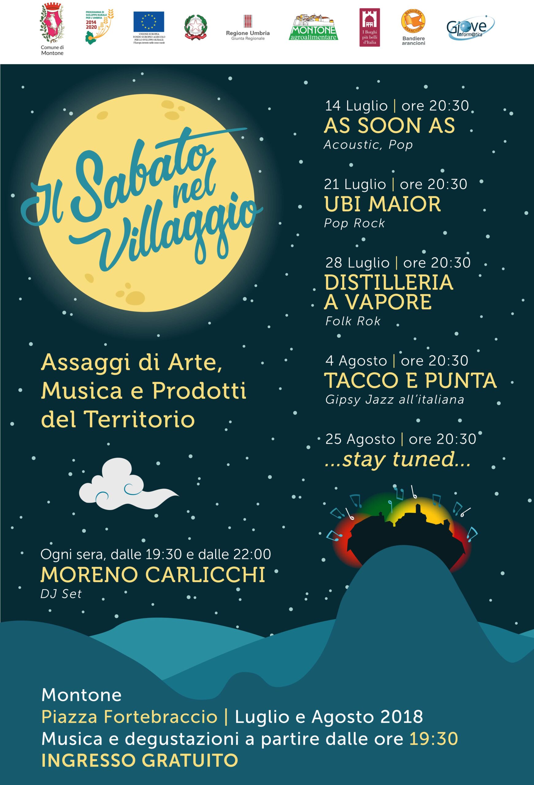 Il Sabato nel Villaggio / Assaggi di Arte, Musica e Prodotti del Territorio Piazza Fortebraccio a Montone 14 Luglio, ore 20.30 AS SOON AS Jazz 21 Luglio, ore 20.30 UBI MAIOR Pop Rock 28 Luglio, ore 20.30 DISTILLERIE A VAPORE Folk Rock 4 Agosto, ore 20.30