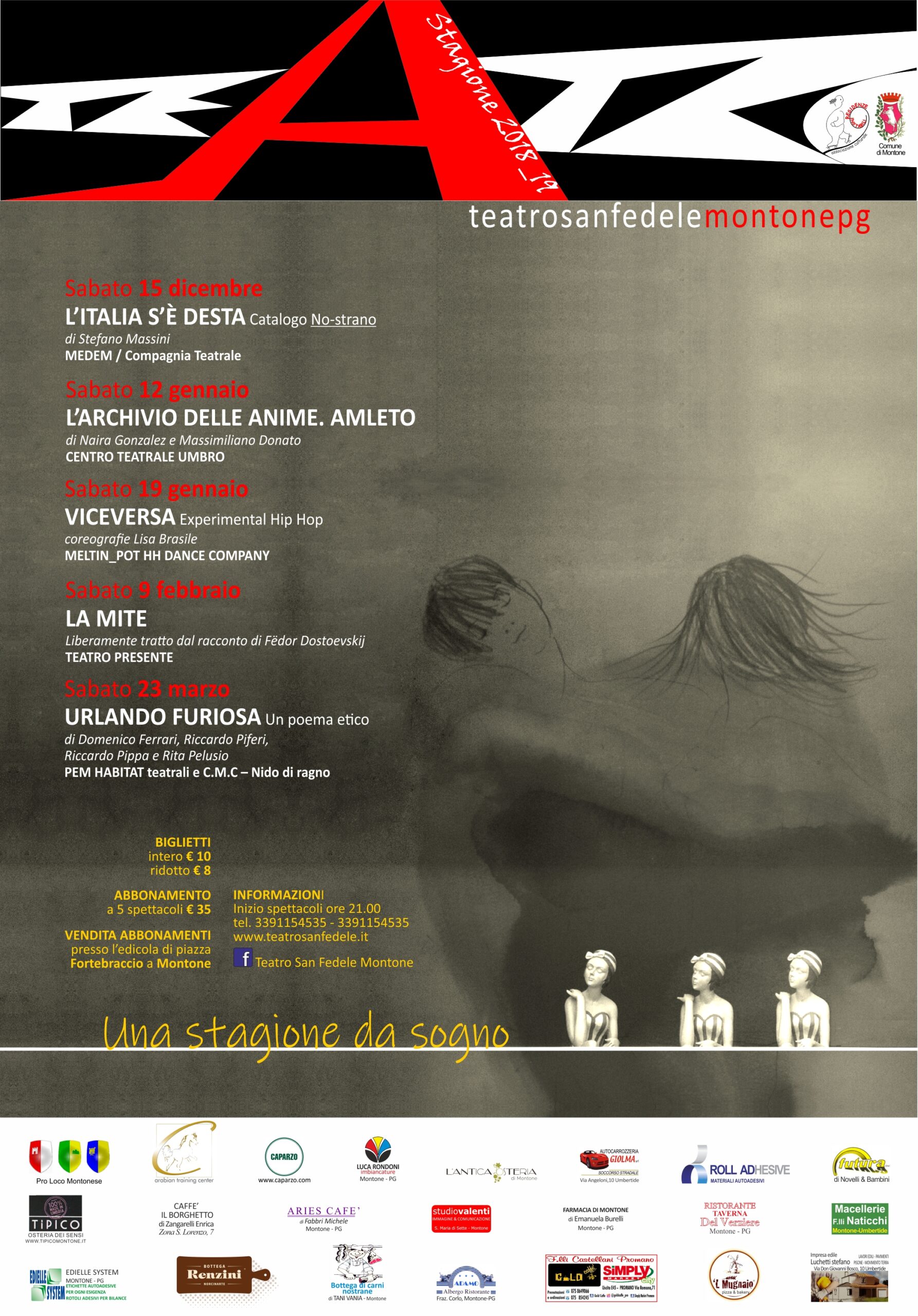 STAGIONE TEATRALE 2018/19 Teatro San Fedele – Montone (PG) Residenze Instabili si appresta questo anno alla prova del nove. Nona stagione infatti quella che presenta l’Associazione Montonese, che rinnova con passione e responsabilità il proprio viaggio