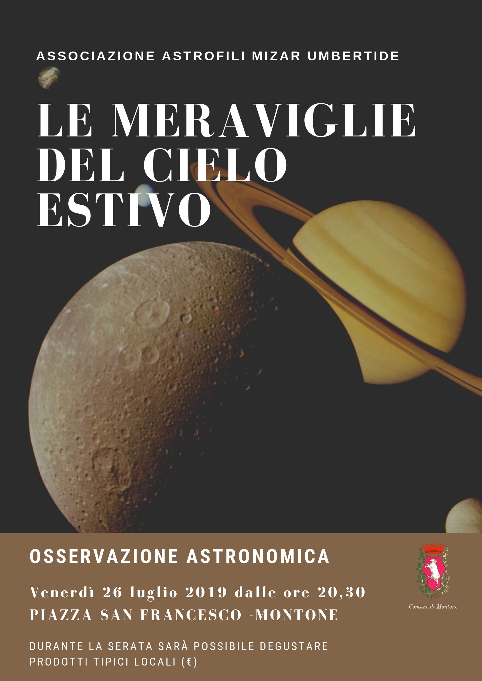 L’ Associazione Astrofili MIZAR di Umbertide coordina l’osservazione delle “Meraviglie del cielo estivo” la sera del 26 luglio alle ore 20,30, in Piazza San Francesco a Montone. Lo scopo dell’associazione è: la divulgazione di argomenti