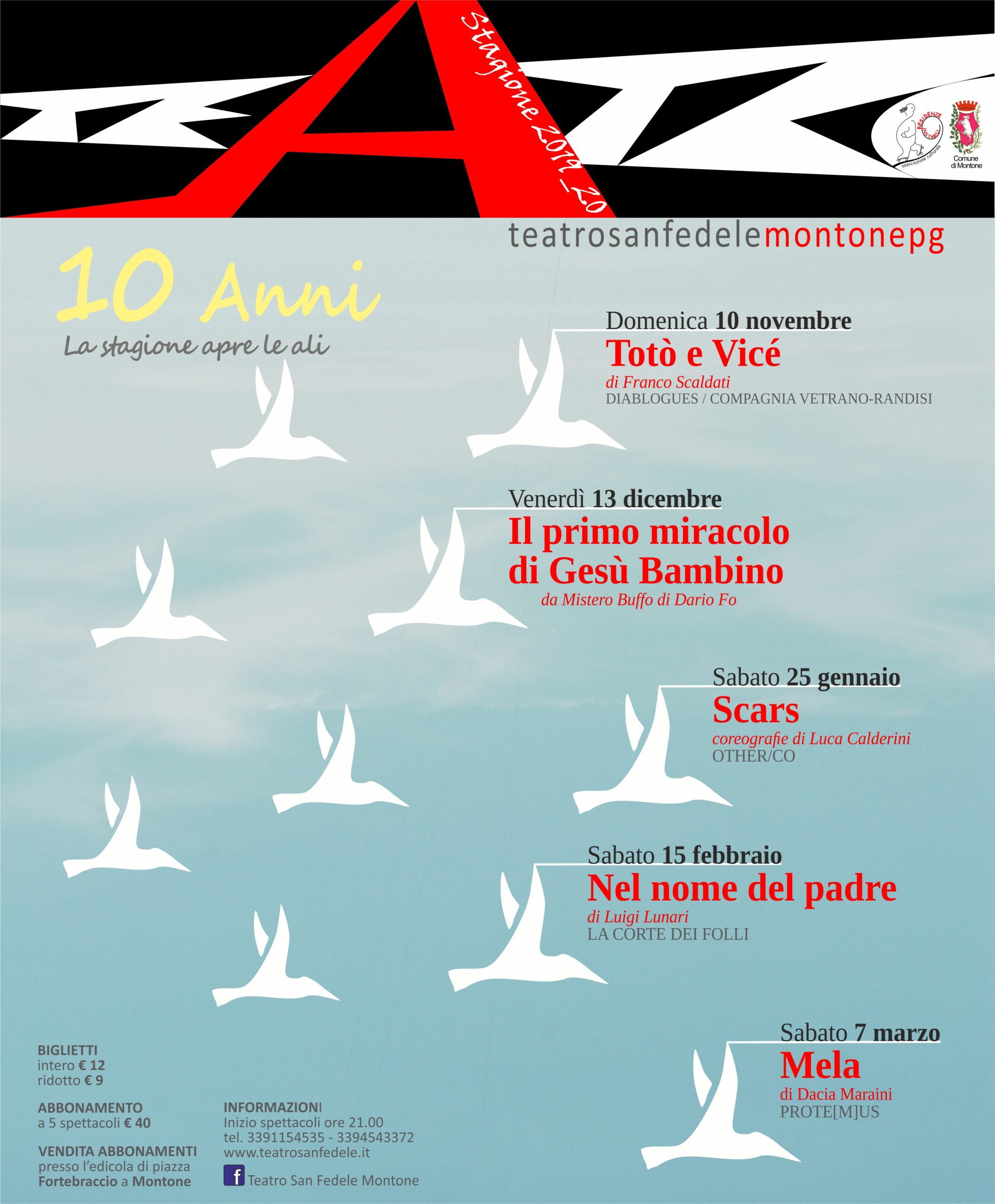 L’Associazione Residenze Instabili, presenta con entusiasmo rinnovato al suo decimo anno di attività’, la nuova Stagione di Prosa 2019/20 promossa al Teatro San Fedele di Montone (Pg). Una stagione che prenderà’ il volo!!! Dalla prossima sett