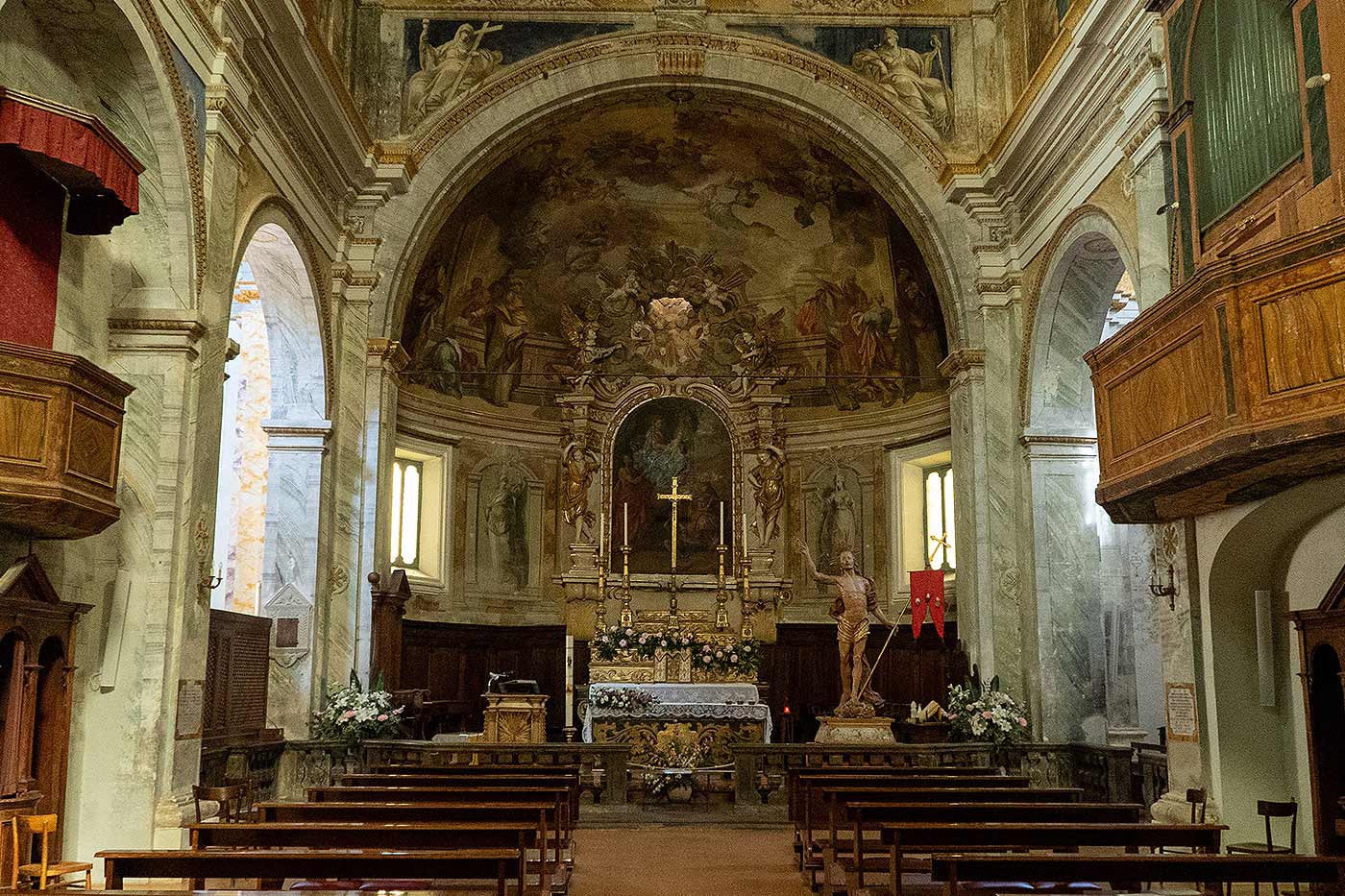 Un maestoso arco introduce l’abside. La mostra dell’altare maggiore è costituita da due colonne in forma d’angelo, capitelli compositi reggono il timpano che è spezzato da una fuga di nubi che sfumano nella minuscola finestrella da cui scende lo Spirito Santo tra angeli musici. La mostra fu realizzata in stucco, alla fine del secolo XVII e ripropone i temi classici della cultura barocca. L’affresco, che decora il soffitto concavo dell’abside, integra consapevolmente l’ornamentazione in rilievo, raffigurando la Pentecoste. Fu dipinto nel 1784 dal fiorentino Giuseppe Parenti. Una pala d’altare della fine del ‘600, che ritrae Maria in trono con il Bambino, san Gregorio Magno e il Battista è inserita in questa cornice monumentale.