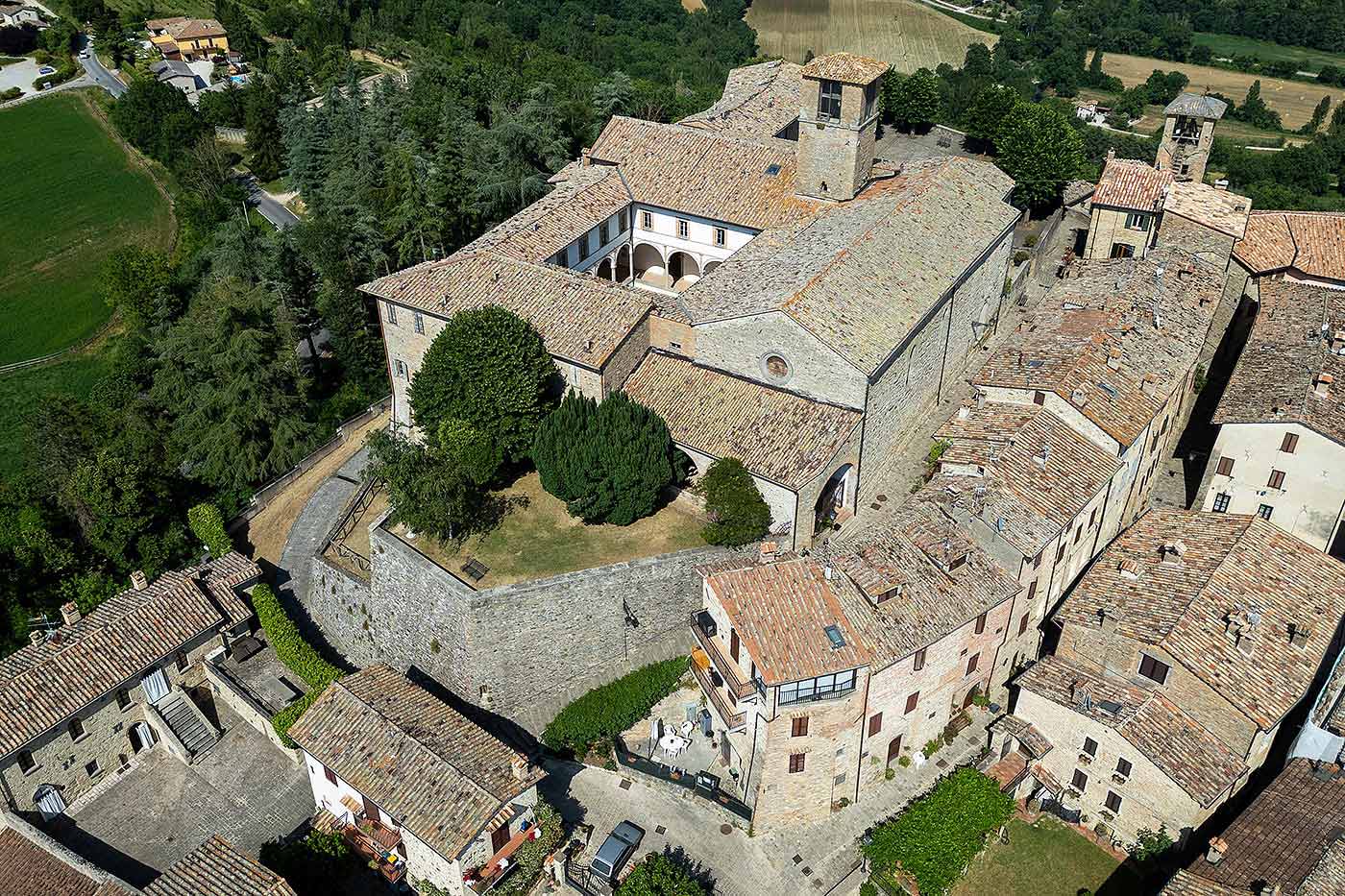 Fu costruito all’inizio del XIV secolo sul lato della chiesa esposto a nord e contestualmente ad essa, imperniato probabilmente sulle rovine del Castel Vecchio. Il corpo di fabbrica più antico, è costituito da una costruzione posta trasversalmente rispetto alla chiesa in corrispondenza del massiccio campanile. Nel 1473 il papa Sisto IV, che era stato Ministro generale dell’Ordine dei minori, dispose con un breve che i conventi potessero vendere beni e terreni ricevuti in dono, per la realizzazione di opere necessarie al decoro degli edifici. Così, cospicue somme di denaro provenienti dall’alienazione di alcune case e terreni, insieme alle largizioni di diversi benefattori, produssero sul volgere del secolo XV grandi lavori di ammodernamento del convento, a cominciare dalla sacrestia della chiesa, la condotta per la cisterna dell’acqua, il dormitorio e altri, che si concretizzarono durante la prima metà del Cinquecento anche, con la realizzazione del nuovo chiostro.