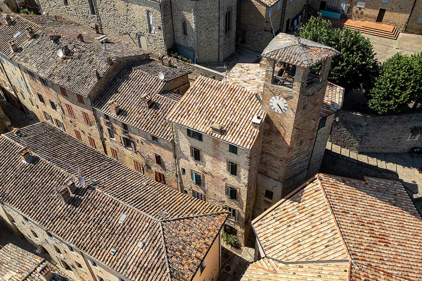 Il livello immediatamente superiore ospita una sala dalla volta a vela che dalla sua origine fino agli anni ’80 del Novecento ha custodito l’archivio comunale, salendo ancora troviamo l’altissimo vano in cui scorrevano i pesi motore dell’orologio e, nella saletta sotto la cella campanaria, il meccanismo; nella cella costituita da cinque colonnine in laterizio disposte su una pianta trapezoidale, la campana. Nel secolo XVI era già presente l’orologio –