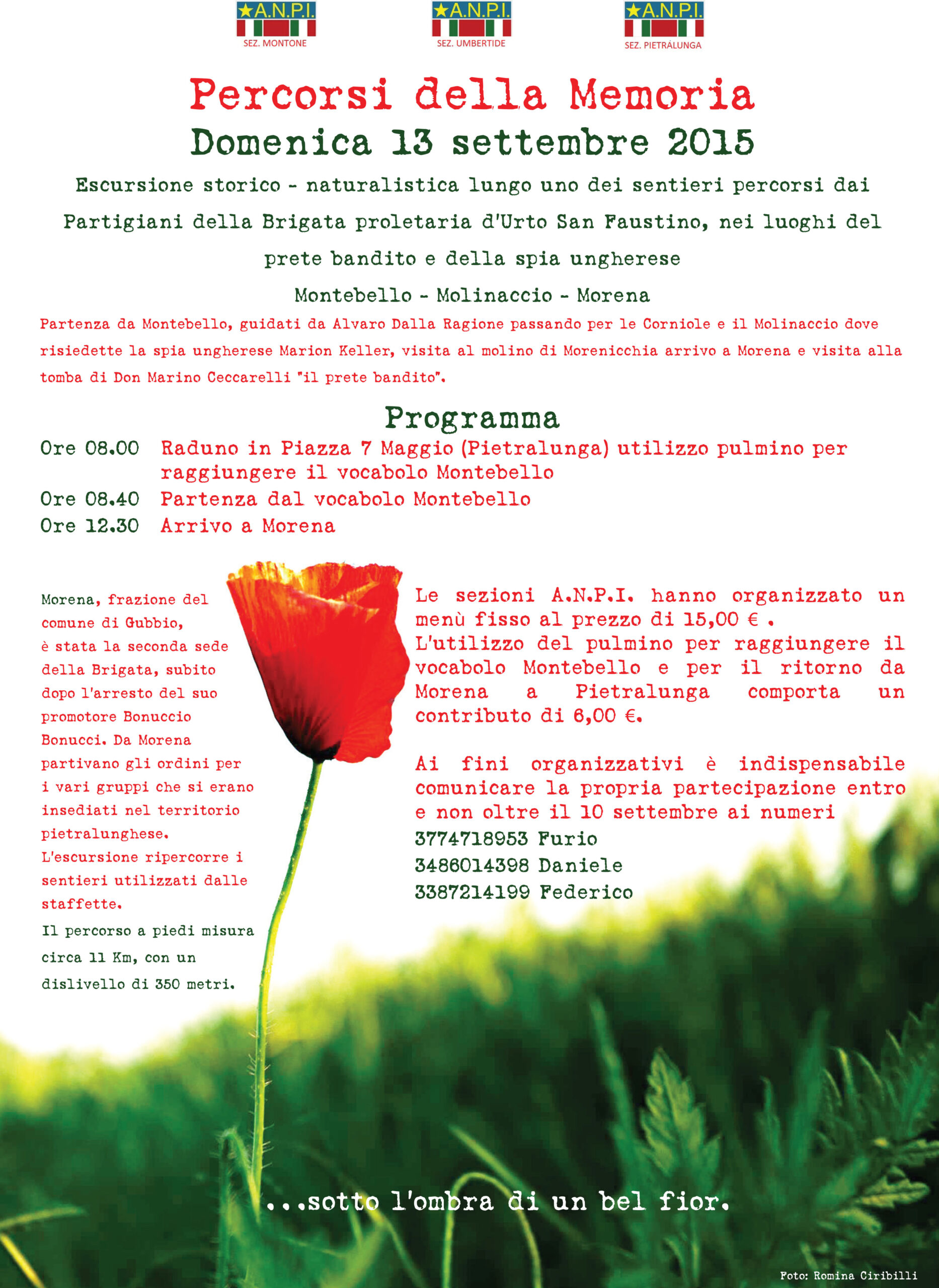 Domenica 13 settembre 2015, dalle ore 8,00 alle ore 12,30. Partenza da Pietralunga. Escursione storico-naturalistica lungo uno dei sentieri percorsi dai Partigiani della Brigata proletaria d’urto “San Faustino”: Montebello, Molinaccio, Morena. Il perco