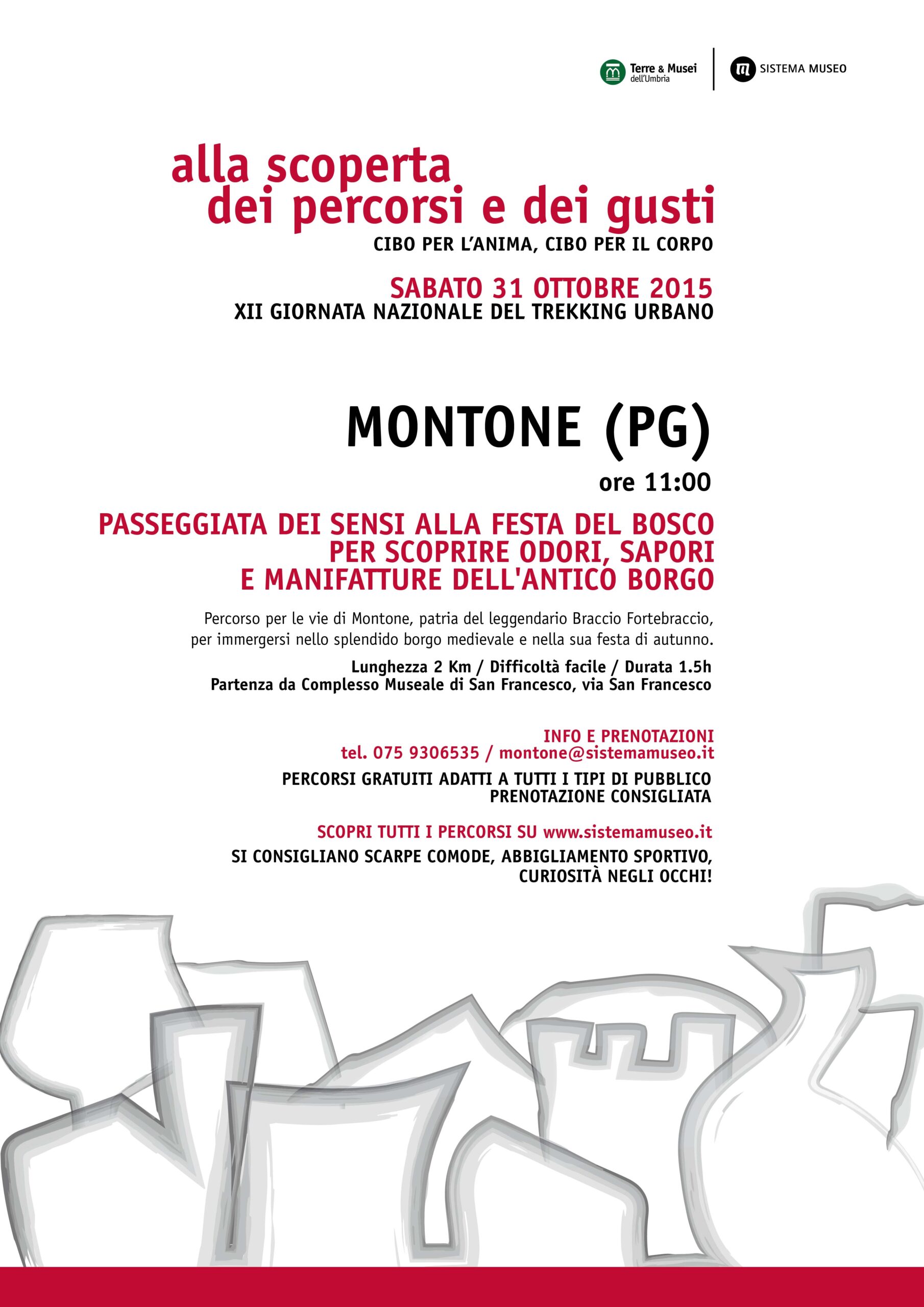 Ore 11,00 XII Giornata Nazionale del Trekking Urbano Alla scoperta dei percorsi e dei gusti. Cibo Per L’anima, Cibo Per Il Corpo Percorso a piedi per le vie di Montone, patria del leggendario Braccio Fortebraccio. Luogo di incontro: Museo di San Francesco. INIZIAT