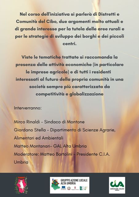 Venerdì 29 ottobre 2021, alle ore 17.00 si terrà presso la Chiesa di San Francesco il seminario sul tema “Distretti e Comunità del Cibo, per una crescita sostenibile delle Aree rurali” ; due temi molto attuali e di grande interesse per la tutela delle aree rurali e per le strategie di sviluppo dei borghi e dei piccoli centri.