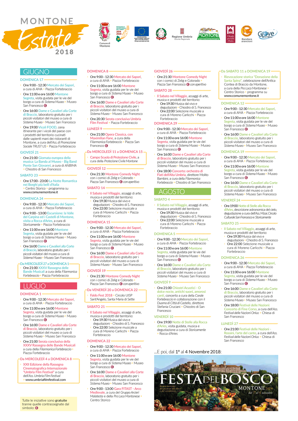 Il borgo Medievale di Montone come non l’avete mai visto. Scene di vita quotidiane, eventi tipici del XV secolo, tornei, mercatini, spettacoli musicali. Incontrerete cavalieri e giovani donzelle. Nobili e cittadini. La rievocazione storica della Donazione della Santa Spina e l’ Umbria Film Festival renderanno ancora più suggestiva l’aria che si respira all’ interno del Borgo Medievale.