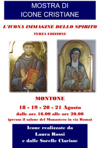 Un viaggio nell’ arte dell’icona. E’ quanto sarà realizzato nel Monastero delle Clarisse di Montone con due iniziative legate al manufatto artistico di grande pregio e valore. Dal 18 al 21 agosto, dalle ore 16 alle 20, sarà possibile visitare la mostra di icone cristiane realizzate dall’ Iconografa Laura Rossi e dalla Sorelle Clarisse. Giunta alla terza edizione l’esposizione sarà allestita nel salone del Monastero, in via Roma.