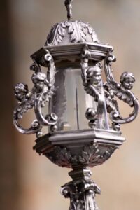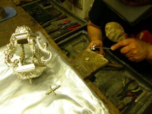La foto riporta un momento del restauro del Reliquiario realizzato da un laboratorio artigianale di manufatti in argento.