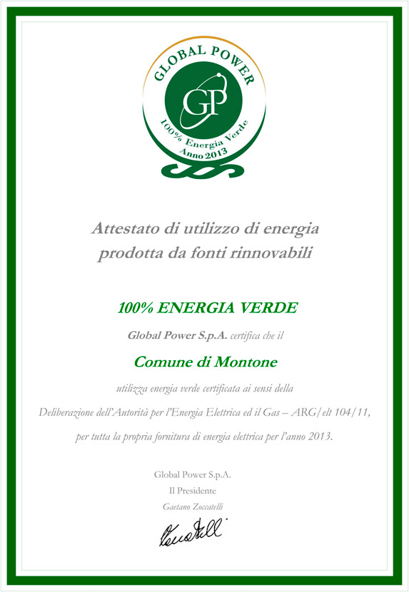 Con questa iniziativa il Consorzio mette a disposizione dell’Ente la documentazione che certifica la provenienza da fonte rinnovabile di tutta l’energia elettrica utilizzata dal Comune di Montone per l’illuminazione pubblica e gli edifici di proprietà. Scegliendo energia pulita, dunque, il Comune di Montone realizza un’azione concreta che si traduce in un messaggio importante anche per gli stessi cittadini, verso i quali è utile promuovere una nuova cultura dell’energia.