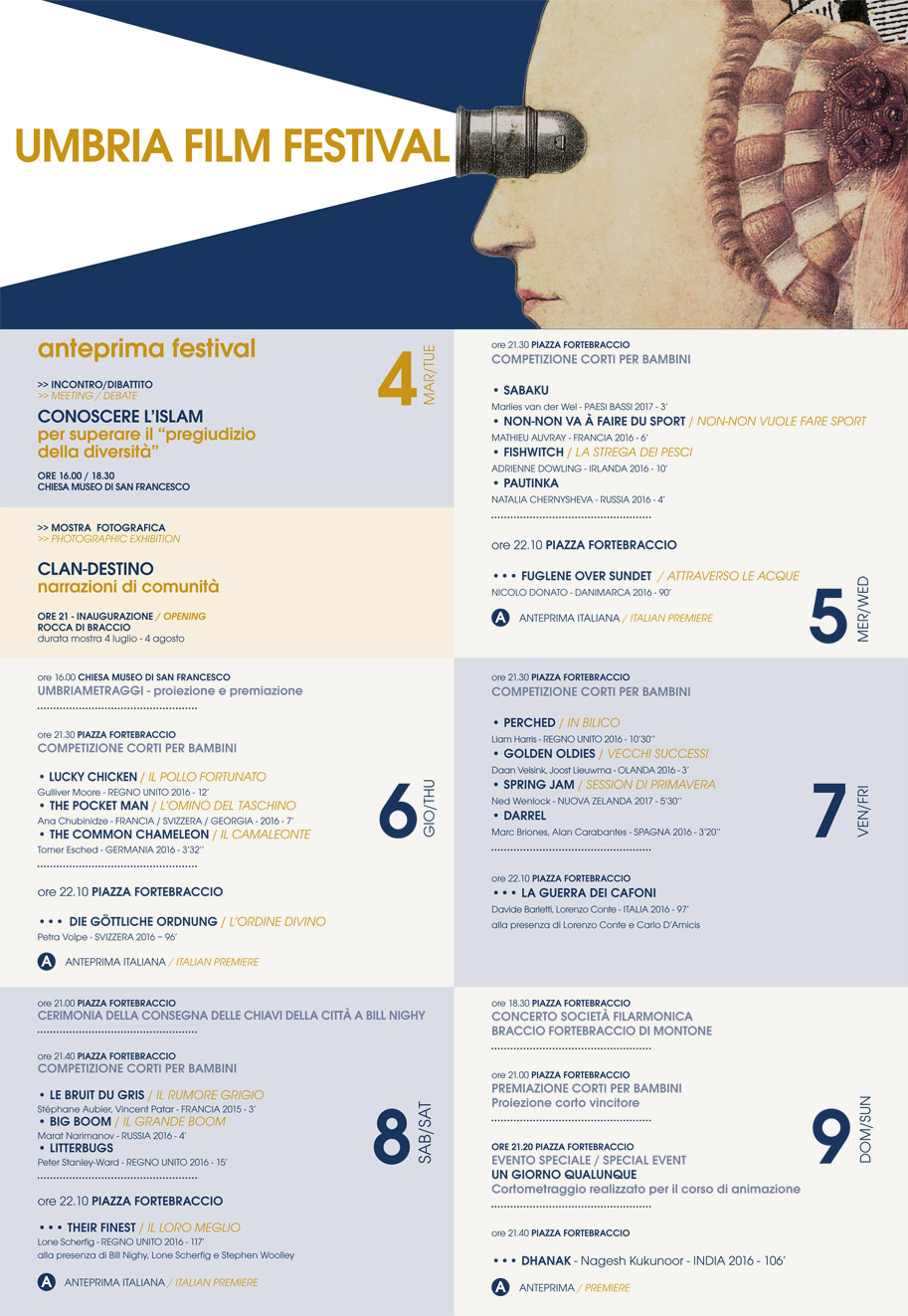 L’UmLEAFLET_exe-2bria Film Festival porta ancora una volta films fuori dai grandi circuiti di distribuzione, con una formula che alla qualità delle proiezioni in piazza unisce da sempre l’attenzione per i mutamenti sociali e per il dialogo multiculturale, la capacità di innovare.  “Il Festival Svelato”, con un’anteprima il 4 luglio per la sezione Migranti, che quest’anno propone un confronto sul tema “Conoscere l’Islam per sconfiggere il pregiudizio della diversità” al quale è prevista la presenza dello storico Franco Cardini, e la mostra fotografica “Clan-destino” realizzata con un progetto di fotografia partecipata del Perugia Social Photo Fest e della Regione Umbria che ha coinvolto dieci immigrati richiedenti asilo residenti nel territorio di Montone.