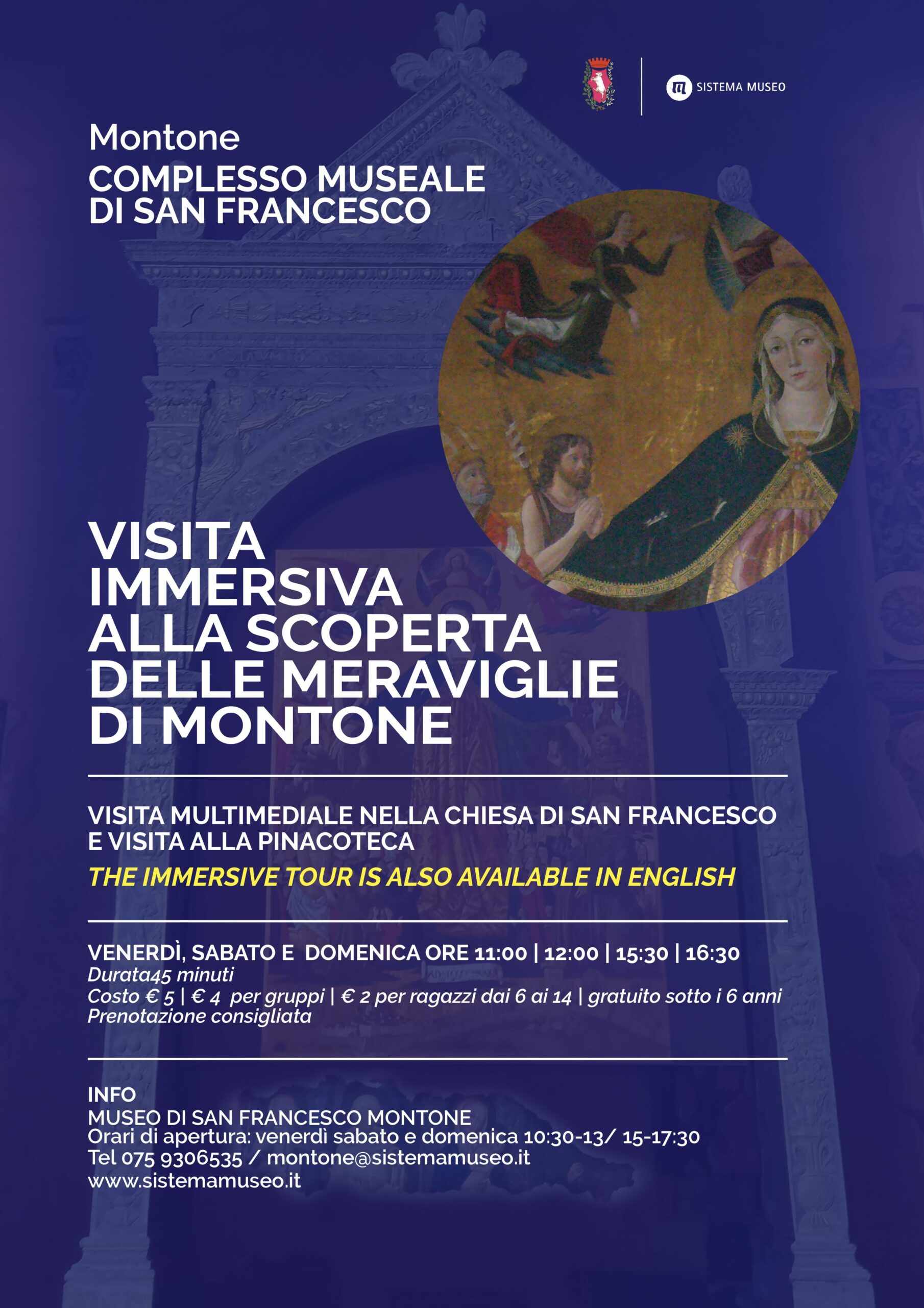 Ad arricchire la narrazione sarà il ricollocamento virtuale della Madonna della Misericordia di Bartolomeo Caporali e una suggestiva illuminazione delle opere della chiesa. Il percorso è in lingua italiana e inglese e percorre le mappe artistiche più significative all’interno della Chiesa, nucleo centrale del museo che conserva al suo interno numerosi lacerti di affreschi per gran parte a carattere votivo e realizzati prevalentemente tal la metà del 1300 e il tardo 1500. Raccontando la storia del borgo medievale, delle sue committenze, dei suoi personaggi e delle tante vicissitudini in cui Montone è stata protagonista, si percorrono alcuni aspetti di particolare importanza storico- artistica.